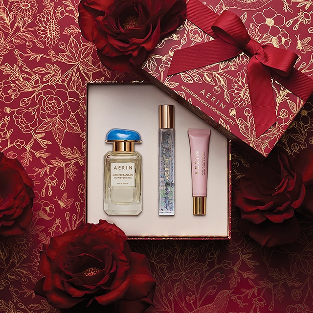 This 3-pc Mediterranean Honeysuckle Set is housed in a keepsake box with AERIN signature pattern re-imagined in red and gold. A red grosgrain bow is affixed to the box for an added holiday touch.